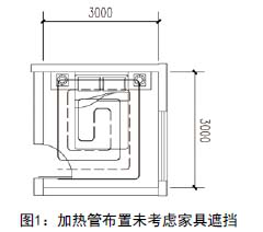 2013年年底,去河北燕郊一朋友的家里做客。客廳的溫度適宜,而臥室的落地的帶儲物箱的床板向上掀開著,剛開始還以為朋友擔心新家具有氣味,在做通風處理。后經朋友解釋,睡覺時,在床上燥熱難受,但臥室內溫度不高,不在床上時,又覺得有點冷。白天,就把床板掀開,不然,房間里太冷……究其原因,臥室的面積不大,一張床,占據了房間的一大半面積,而加熱管又集中布置在了床下的位置。以至造成用戶的不適。如圖1所示: