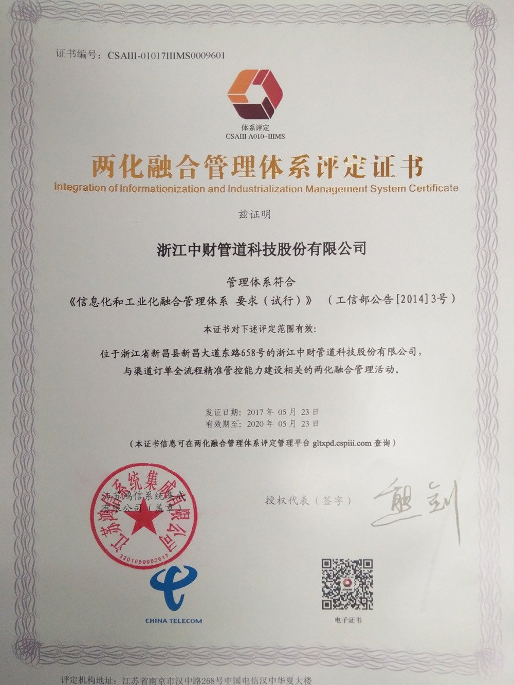 中財訊 浙江中財管道于2016年4月啟動兩化融合貫標體系建設,經過工信部專家現場評審、合規性審查、復核和公示等環節,最終通過國家兩化融合管理體系認定,榮獲工信部頒布的《兩化融合管理體系評定證書》,同時獲得新昌縣政府資金獎勵100萬元。榮譽的獲得是對我公司兩化融合體系建設工作的肯定,也是對我公司應用信息化技術手段促進企業技術提升、產品提質、管理提效能力的認可。