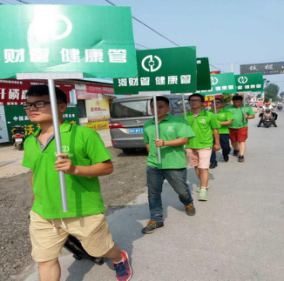 下午以及隨后的3天,各組進(jìn)入緊張的比拼狀態(tài),走訪經(jīng)銷商、張貼廣告、拜訪客戶、敲定門招,通過聲勢浩大的地毯式掃街宣傳,開發(fā)城區(qū)鄉(xiāng)鎮(zhèn)意向客戶、促成訂單,極大的宣傳了“河財管,健康管”的產(chǎn)品理念。
